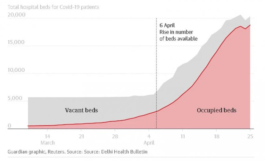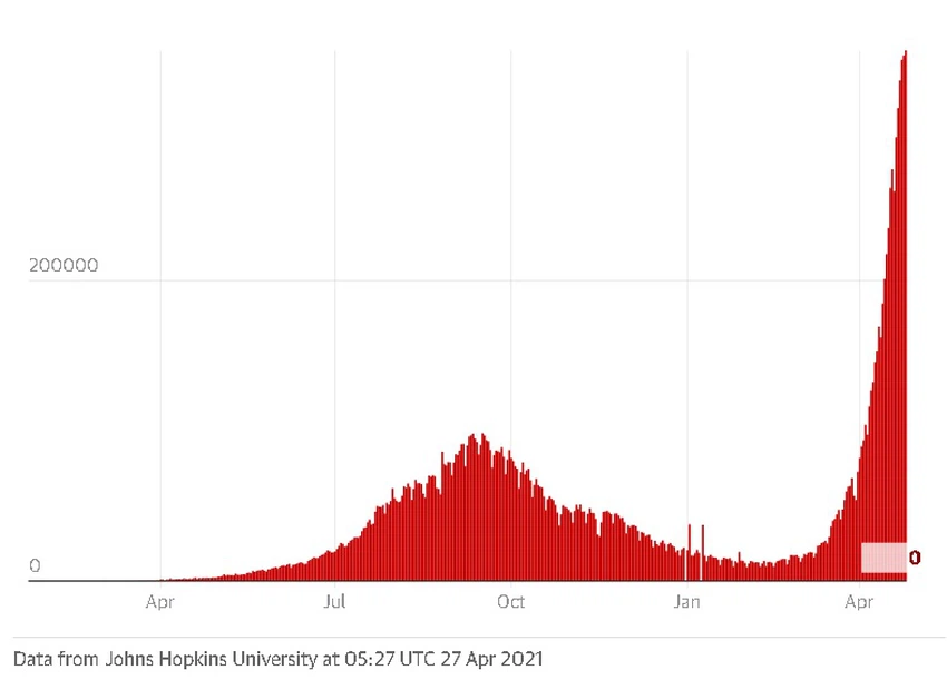 كانت الهند قد خففت إلى حد كبير من إجراءات التباعد الاجتماعي والحجر الصحي بحلول شهر مارس - وهو قرار يُنظر إليه الآن على أنه سوء تقدير كبير للسياسيين وأصحاب القرار في البلاد، فقد بدأت أعداد الحالات الرسمية في الهند في الانخفاض بشكل حاد منذ سبتمبر. كان من الممكن أن تكون فرصة لدعم نظام الرعاية الصحية في البلاد وبناء البنية التحتية للتطعيم قبل أن تضرب الموجة الثانية، والذي حذر العديد من العلماء من أنه أمر لا مفر منه.