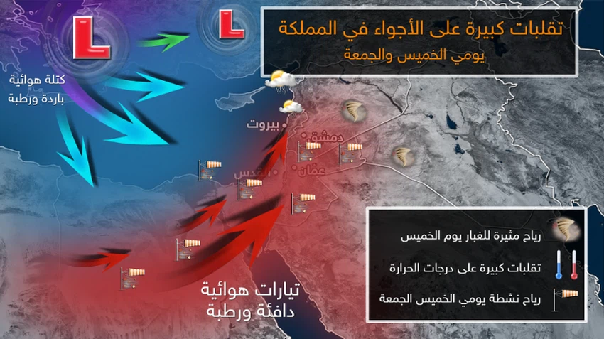 ومع ساعات ما بعد منتصف ليلة الخميس وصباح الجمعة، تندفع نحو المملكة كتلة هوائية باردة نسبياً، تعمل على خفض درجات الحرارة بشكل كبير، لتصبح الحرارة حول معدلاتها العامة، تترافق مع نشاط حركة الرياح السطحية حيث قد تصل سرعة بعض هباتها الى ما بين 50-60 كم/ساعة.