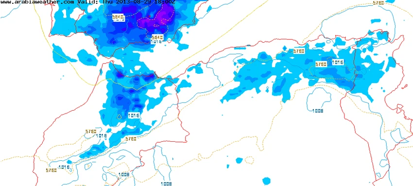 موقع ArabiaWeather.com - تُشير بيانات النماذج العددية المُختلفة إلى أن بعض المناطق و الدول العربية ستشهد يوم الخميس 29-8-2013 الموافق لـ 22-10-1434 هـ إضطرابات جوية عدّة ستعمل بإذن الله على تساقُط الأمطار على النحو التالي: