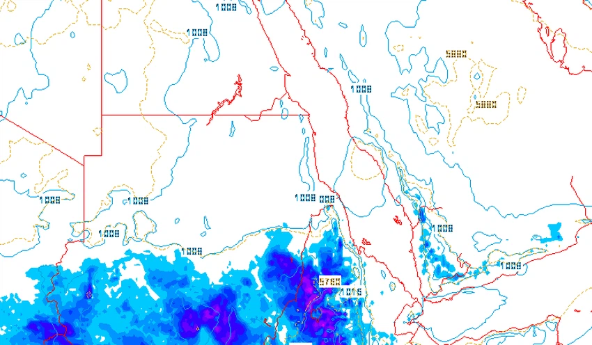 و يمتد الغطاء السحابي المُمطر بإذن الله إلى أجزاء محدودة من مرتفعات جنوب غرب السعودية.