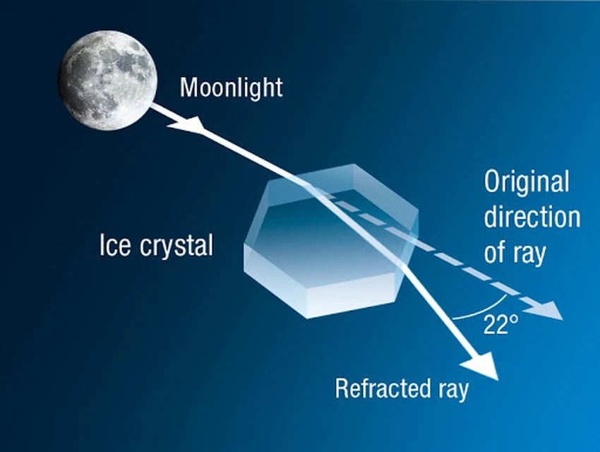 للجليد بنية جزيئية سداسية ينتج عنها بلورات جليدية على شكل موشورات سداسية، تميل وجوهها بزاوية 60 درجة، وعندما يمر ضوء القمر خلال ملايين البلورات الجليدية الصغيرة المعلقة في الغلاف الجوي ينكسر مرتين، مما يؤدي إلى انحرافه بزاوية ما بين 22 – 50 درجة، إلا أن الهالات الصغيرة الناتجة عن انحراف الضوء بزاوية 22 درجة هي الأكثر شيوعاً مع القمر.