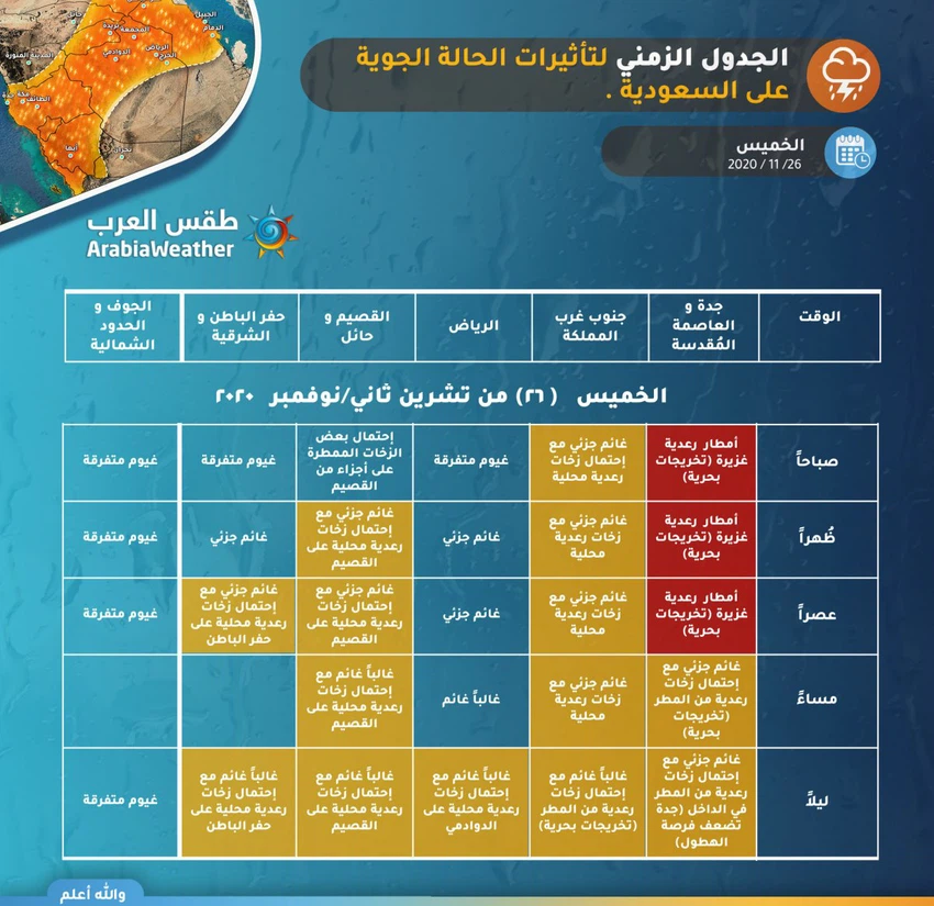 ويُتوقع أن تكون السحب الرعدية أكثر غزارة في جنوب غرب البلاد بحيث تؤدي الى تشكل السيول أحياناً والتجمعات المائية ونشاط الرياح الهابطة كما هو موضح في الجدول المُرفق والذي يوضح التسلسل الزمني للحالة الجوية سقيا على مختلف المناطق المذكورة بمشيئة الله.