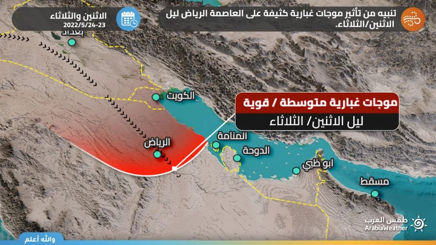 وتُشير آخر مخرجات أنظمة المُحاكاة الحاسوبية لحركة الرياح إضافة لما يتم رصده الآن عبر آخر صور الأقمار الإصطناعية إلى موجة الغبار ستدخل أجواء مدينة العاصمة الرياض مع مساء وليل الإثنين/الثلاثاء، على شكل موجة من الغبار المنقول والعوالق الترابية، جدارية الطابع وعالية الكثافة، تهوي بمدى الرؤية الأفقية لحدود الـ 500 وربما أقل.