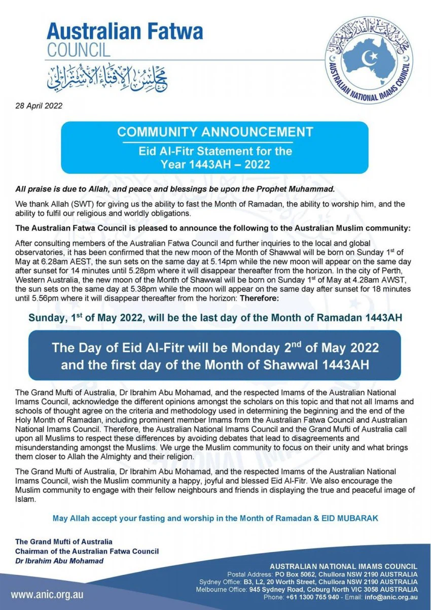 طقس العرب - أعلن مجلس الأئمة الوطني الأسترالي في بيان له اليوم وبعد مشاورات مكثفة مع القيادات الإسلامية على مستوى الأمة في أستراليا وممثليهم، مكتب مفتي أستراليا الدكتور إبراهيم أبو محمد ومجلس الأئمة الوطني الأسترالي أن يوم الأحد القادم سيكون المتمم لشهر رمضان، يوم الاثنين 2 مايو هو أول أيام عيد الفطر السعيد.