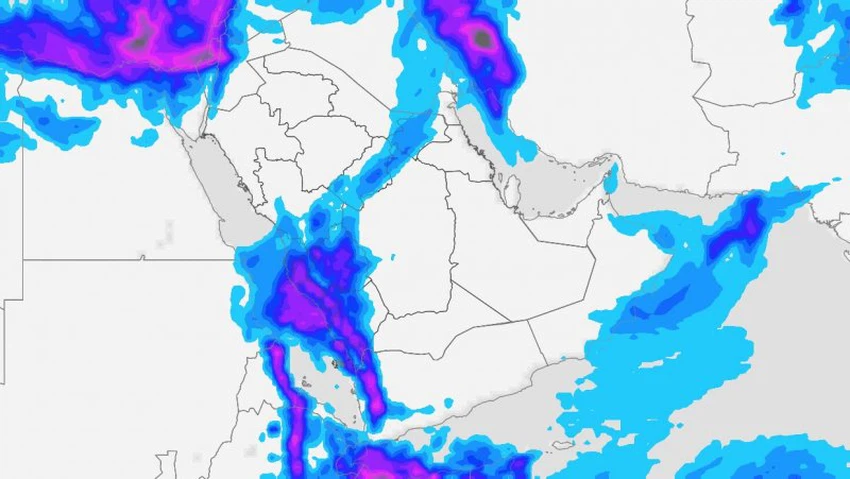 الخريطة تمثل تراكمي الأمطار من الأربعاء و حتى مساء الخميس بحسب النموذج الأمريكي.