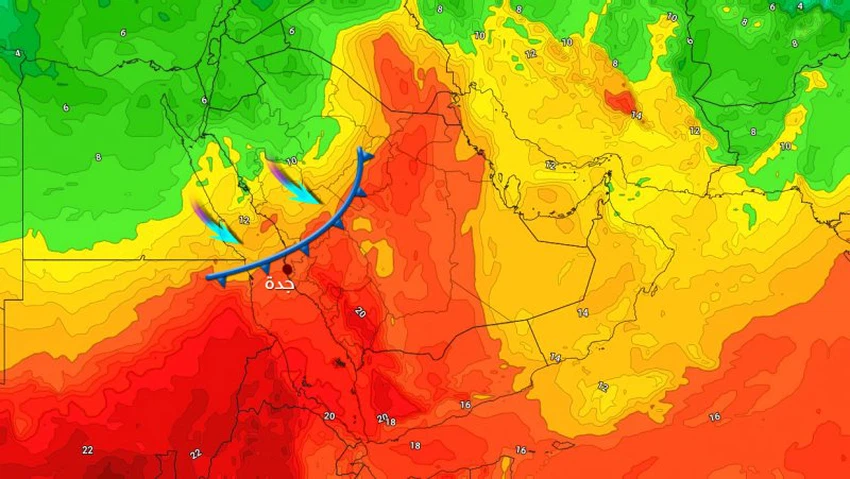 الخريطة تمثل مكان الجبهة الهوائية الباردة صباح الخميس واقترابها من مدينة جدة