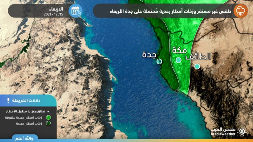 وفي التفاصيل، فيُتوقع أن تتأثر جدة بأحوال جوية غير مستقرة يوم الأربعاء خاصةً مع ساعات المساء والليل، إذ تعبُر تشكيلات من السحب الركامية الرعدية على فترات، تترافق بزخات متفاوتة من الأمطار، ولا يُستبعد أن تكون الأمطار غزيرة احياناً بشكل محلي، وقد تعمل على حدوث التجمعات المائية وارتفاع في منسوب المياه في بعض الطرق.
