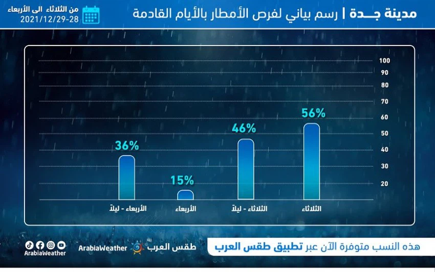 ويود طقس العرب التأكيد على ضرورة متابعة النشرات الجوية الصادرة عن الجهات المختصة، كما سيقوم طقي العرب باطلاق التحديثات حول فرص الأمطار على مدينة جدة كُلما إقتضت الحاجة.