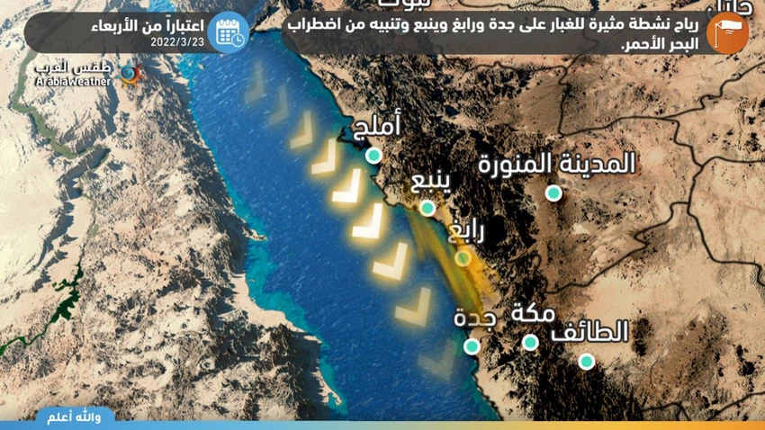 وفي التفاصيل فيُتوقع بمشيئة الله أن تتأثر أجزاء واسعة من شمال ووسط منطقة البحر الأحمر اعتباراً من الأربعاء بهبوب لرياح شمالية إلى شمالية غربية نشطة السرعة تعمل على اضطراب البحر وارتفاع الامواج بشكل لافت، وقد تثير الأتربة والغبار على فترات.