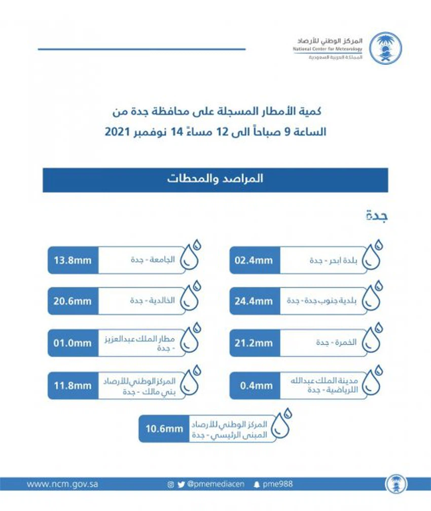 وسجلت بلدية جنوب جدة أعلى كمية أمطار حيث بلغت 24.4 ملم، تبعتها محطة الخمرة والتي سجلت 21.2 ملم، ثم الخالدية بـ 20.6 ملم.