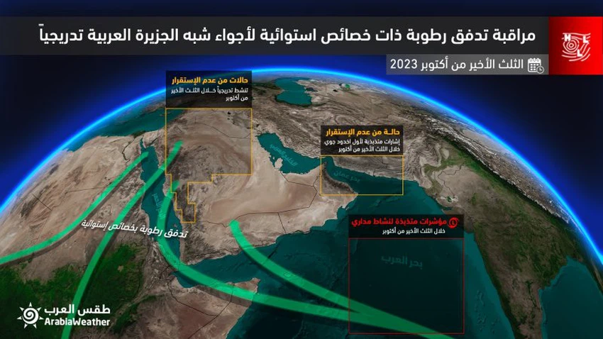 و تُشير أيضاً مُخرجات النمذجة الحاسوبية بأن هناك ازدياد في فرص نشوء أول حالة مدارية في بحر العرب خلال الثلث الأخير من شهر أكتوبر، و يحتاج ذلك المزيد من المُتابعة في حينها.