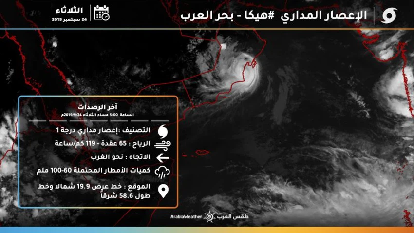 طقس العرب - سنان خلف - تُظهر آخر صور الأقمار الإصطناعية قرب عين الإعصار هيكا من سواحل سلطنة عُمان، حيث يُتوقع ان تلامس عين الإعصار هيكا المنطقة الواقعة مابين جزيرة مصيرة ورأس مدركة مصحوبة بالرياح القوية.