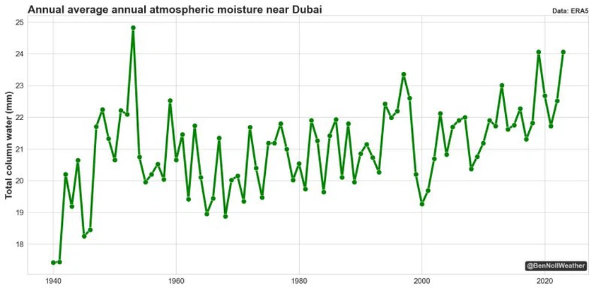 الأمر الذي قد يُثبت فرضية بأن التغير المناخي بالفعل قد كان له دور بالحالة المطرية هو ما تمت مُلاحظته من زيادة نسبة رطوبة الهواء في دبي بنسبة تفوق 7% خلال الـ 80 عاماً الماضي و هذا الاتجاه الذي يشهده المناخ في دبي يعكس الاتجاه العام للكوكب ككل. و في ذات الوقت، يقوم العديد من العلماء و النُشطاء حول الكرة الأرضية في هذه الأوقات بدراسة الحالة المطرية التي أثرت على منطقة شبه الجزيرة العربية وعلاقتها المُباشرة بالتغير المناخي أم لا.