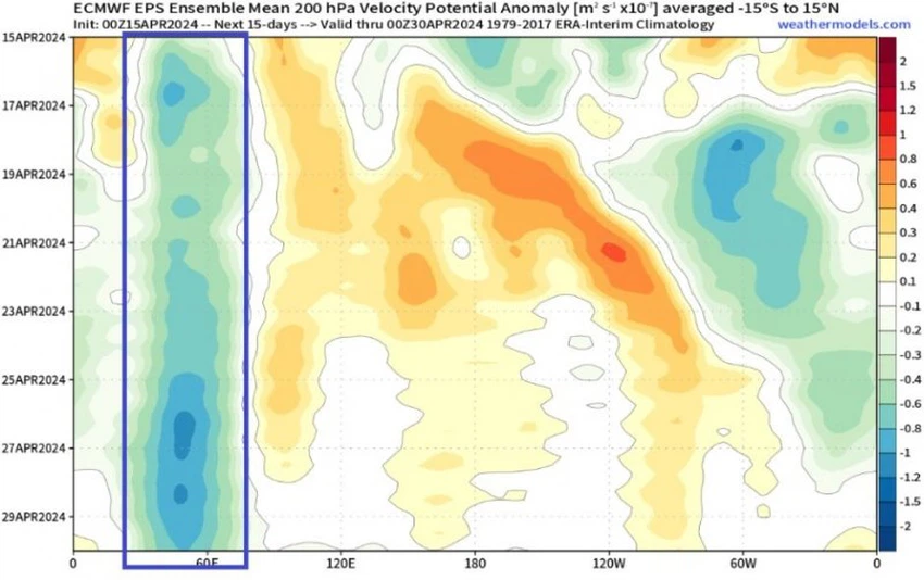 هذه الظروف الجوية تصادفت بمشيئة الله بالتزامن مع وجود المرحلة الرطبة ذات الحمل الحراري الفعال (MJO) فوق غرب المحيط الهندي و بحر العرب، في تظافر لأوضاع جوية لا تتكرر كثيراً، تسببت مُجتمعة بحالة ربيعية تاريخية.