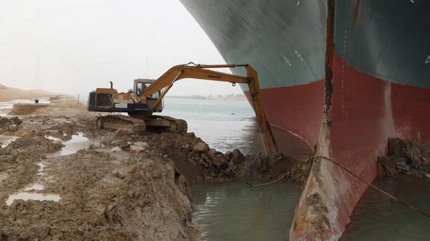 صورة من عملية ازالة الأتربة في محاولة لاعادة تعويم السفينة الجانحة