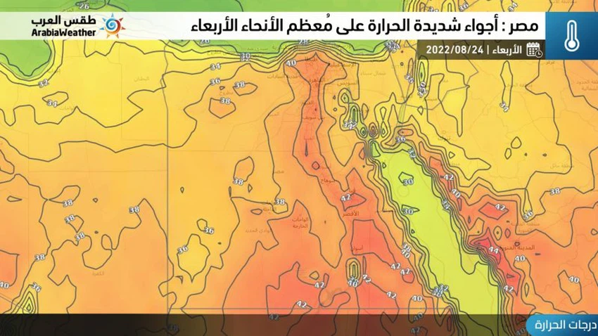 طقس العرب - أظهرت نتائج تحليل آخر الخرائط الجوية عبر نظام بدر المطور من قبل طقس العرب إلى استمرار تأثر مصر يوم الأربعاء 24-8-2022 بِكُتلة هوائية شديدة الحرارة، ويكون الطقس شديد الحرارة في أغلب المناطق بمشيئة الله.
