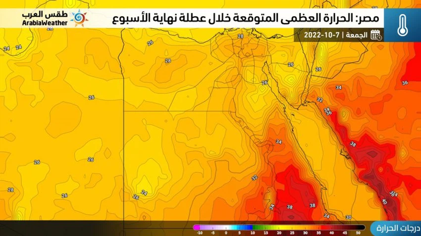 وفي التفاصيل، تنخفض درجات الحرارة في مصر أيام الجمعة والسبت والأحد، بحيث تُصبح أقل من مُعدلاتها المُعتادة نسبةً لمثل هذا الوقت من العام بحوالي 3-4 درجات مئوية، وتكون الأجواء مُعتدلة ورطبة على المناطق الشمالية وصولاً حتى القاهرة الكبرى وشمال الصعيد مع ظهور سحب مُتفرقة على ارتفاعات مُنخفضة خاصةً مع ساعات الصباح، وحارة نسبياً إلى حار في باقي الأنحاء بما في ذلك مناطق الصعيد، وتكون الفرصة مهيأة لهطول أمطار مُتفرقة على أجزاء محدودة من الساحل الشمالي قد تمتد لأجزاء من شمال الدلتا.