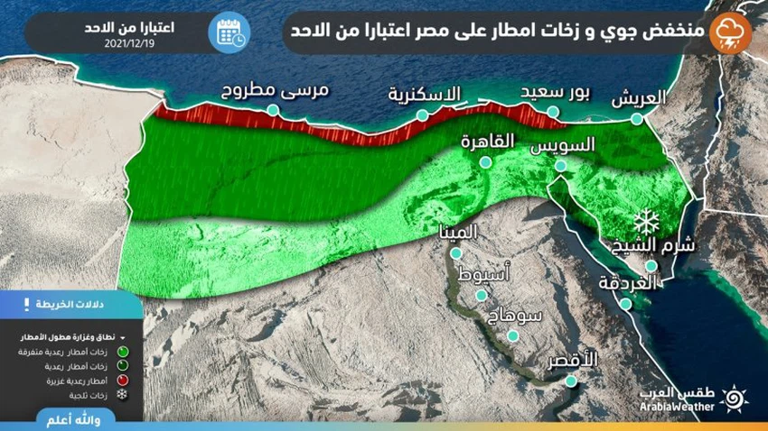 ومع ساعات ليلة الأحد/الإثنين تعبُر البلاد تدريجياً جبهة هوائية باردة عالية الفعالية بحيث تبدأ الأمطار بالهطول بغزارة في مطروح ليكون الطقس بارداً وغائماً وماطراً بمشيئة الله في مطروح، ويُتوقع أن تكون الأمطار غزيرة ومُرفقة مع تساقط لزخات من البَرَد أحياناً، ومع ساعات مُنتصف الليل تنتشر الأمطار تدريجياً لعموم مناطق الساحل الشمالي والدلتا والقاهرة الكبرى وصولاً لأجزاء من شمال الصعيد، وتكون الأمطار متفاوتة الشدّة وغزيرة في بعض النطاقات الجغرافية ما يعمل على تشكل السيول وارتفاع منسوب المياه في الطرقات في العديد من المناطق الشمالية.
