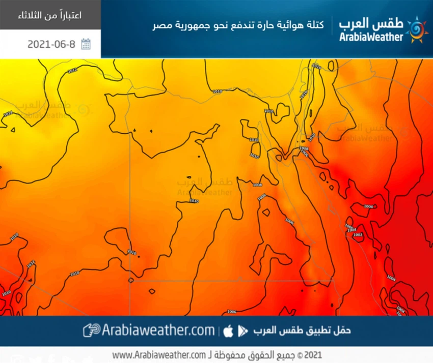 طقس العرب - يبدأ الأسبوع القادم بطقس صيفي اعتيادي نهاراً ورطب ليلاً بمشيئة الله في مختلف المناطق، وفي النصف الثاني من الأسبوع يتوقع ان تندفع نحو عموم جمهورية مصر كتلة هوائية حارة ترتفع درجات الحرارة على إثرها بشكل ملموس.