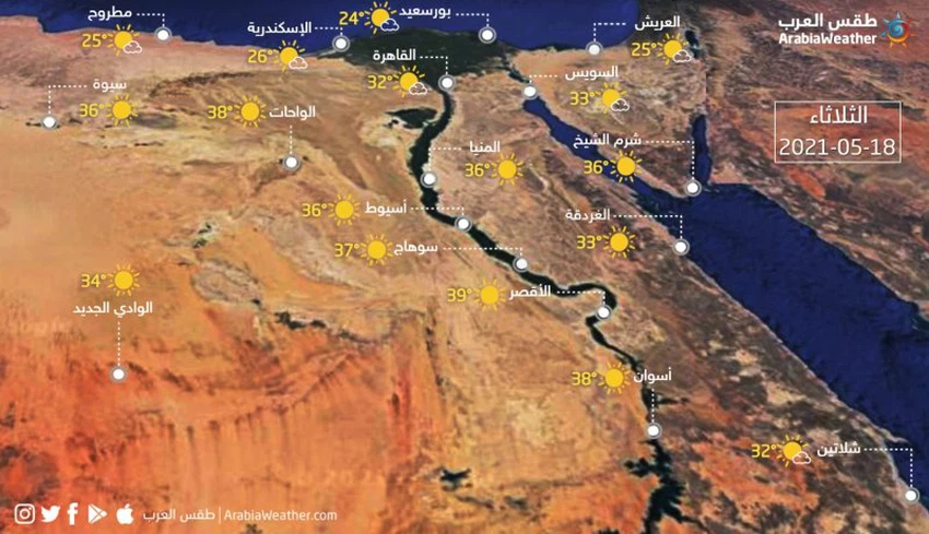 طقس العرب - يطرأ ارتفاع طفيف على درجات الحرارة، مع بقائها حول إلى اعلى بقليل من مُعدلاتها نسبةً لمثل هذا الوقت من العام، ليسود طقس معتدل على السواحل الشمالية وحارّ على الدلتا والقاهرة الكبرى ومدن القناة ووسط وشمال سيناء وسواحل البحر الأحمر وشمال الصعيد وشديد الحرارة على باقي المناطق، فيما يسود طقس لطيف إلى مُعتدل بوجهٍ عام خلال ساعات الليل.