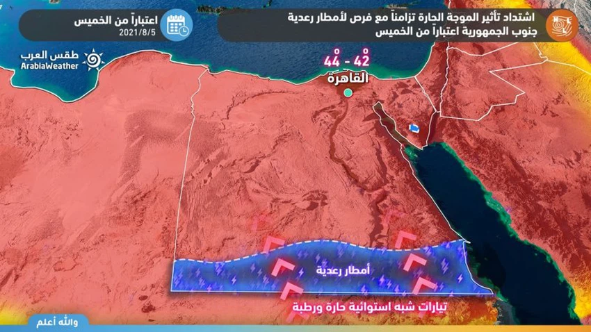 وفي التفاصيل، يُتوقع تعمق تأثير الموجة الحارّة على جمهورية مصر خلال الأيام القادمة، إثر تدفق المزيد من التيارات الهوائية الحارّة في طبقات الجو القريبة من سطح الأرض والقادمة من كلاً من الجزيرة العربية والأراضي السودانية، ليسود طقس شديد الحرارة خاصةً في ساعات الظهيرة والعصر في أغلب المناطق لتكون درجات الحرارة حول الـ 43 درجة مئوية في العديد من القرى والمُدن المصرية بما فيها العاصمة القاهرة، كما ويكون طقس شديد الحرارة طيلة ساعات النهار في المناطق الجنوبية، أما المناطق الساحلية فيُتوقع أن تعيّش الأمرين، إذ عادةً تكون بمنأى عن الموجات الحارة بسبب تدفق رياح أقل حرارة من فوق البحر إلى اليابسة، لكن بالتزامن مع ارتفاع الحرارة ترتفع نسب الرطوبة الأمر الذي يزيد من الإحساس بالحرارة بشكلٍ كبير.