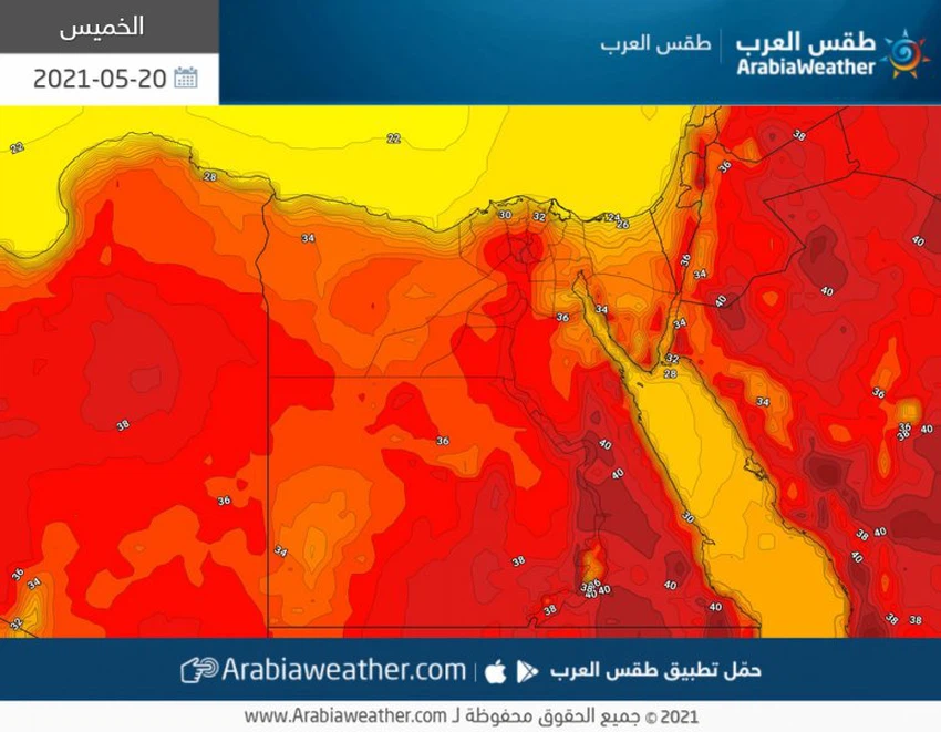 ترتفع درجات الحرارة الخميس في عموم محافظات ومُدن مصر، حيثُ يسود طقس معتدل إلى حارّاً نسبياً على السواحل الشمالية وسواحل البحر الأحمر وحارّ على الدلتا والقاهرة الكبرى ومدن القناة ووسط وجنوب سيناء وشديد الحرارة على باقي المناطق، وتكون الرياح شمالية إلى شمالية شرقية مُعتدلة السرعة، تنشط احياناً في اجزاء من مناطق القاهرة الكبرى والدلتا وشمال الصعيد ومدن القناة وسواحخليج السويس، وتكون مُثيرة للغبار والأتربة في مطروح وسيناء وشمال الصعيد واسوان، وتظهر غيوم مُتفرقة على ارتفاعات مُتوسطة وعالية، في حين يكون الطقس معتدلاً إلى لطيف بوجهٍ عام على معظم مناطق الجمهورية ليلاً.