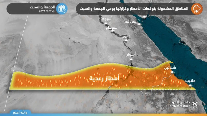 وفي التفاصيل، يندفع الفاصل المداري شمالاً خلال الايام القادمة ليأخذ موقعه بالقرب من شمال الأراضي السودانية، الأمر الذي يُحفز اندافاع تيارات هوائية شبه استوائية نحو الأجزاء الجنوبية من الجمهورية لتتكاثف السحب الركامية والغيوم يومي الجمعة والسبت خاصةً بُعيد ساعات العصر والمساء، لتشمل الأمطار أجزاء واسعة من المناطق الساحلية الجنوبية بما في ذلك حلايب والشلاتين، وتمتد للمناطق الداخلية الجنوبية لتشمل أجزاء من أسوان خاصةً الأجزاء الجنوبية منها.