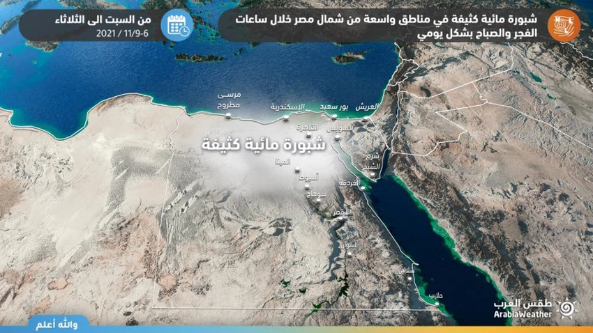 وفي التفاصيل، تنشط الرياح الشمالية التي تمر على البحر الأبيض المتوسط، وتحمل كميات كبيرة جداً من الرطوبة مع الهدوء في سرعات الرياح وانخفاض في درجات الحرارة الصغرى، تكون الظروف ملائمة تماماً لتشكل الشبورة المائية وبشكلٍ كثيف لتشمل أجزاء واسعة من المناطقة الشمالية خلال ساعات الفجر والصباح بشكلٍ يومي خلال الأيام القادمة، وبالتالي تنخفض الرؤية إلي أقل من 500 متر علي معظم الأنحاء من القاهرة والوجة البحري ومدن القناة والسواحل الغربية وشمال ووسط سيناء.