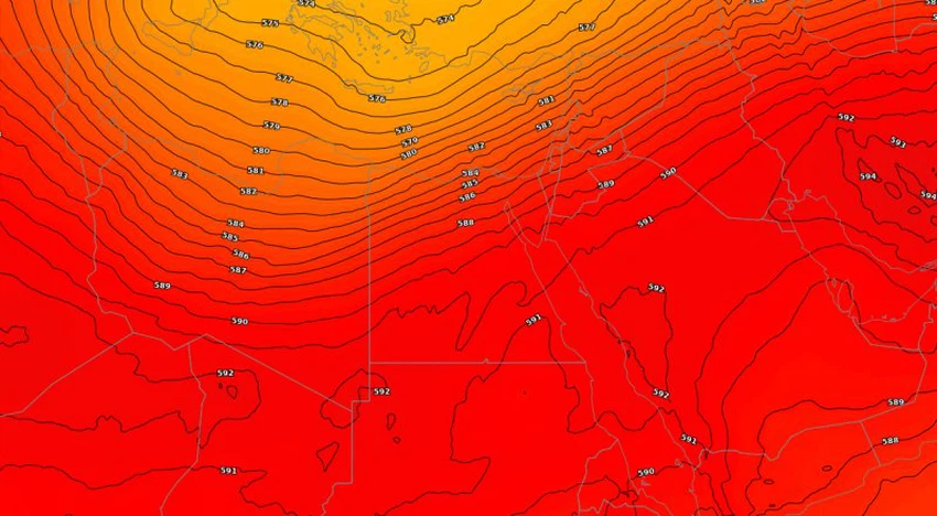 طقس العرب - يستمر تأثر جمهورية مصر بالكتلة الهوائية الحارّة نهاية الأسبوع بحيث تستمر درجات الحرارة في مستويات عالية نتيجة تمدد المنخفض الجوي الحراري من الشرق بالتزامن مع سيطرة المرتفع العلوي فوق المنطقة.