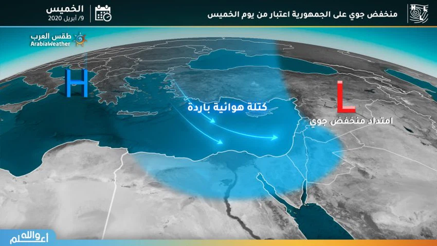 وفي التفاصيل ، تتحرك كتلة هوائية باردة قادمة من شرق القارة الاوروبية نحو شرق البحر المتوسط، يتشكل على اثرها منخفض جوي فوق شمال جزيرة قبرص يوم الجمعة حيث تصبح الاجواء غير مستقرة على الساحل الشمالي و شمال سيناء و تهطل زخات من الامطار و تنشط الرياح الشمالية الغربية.