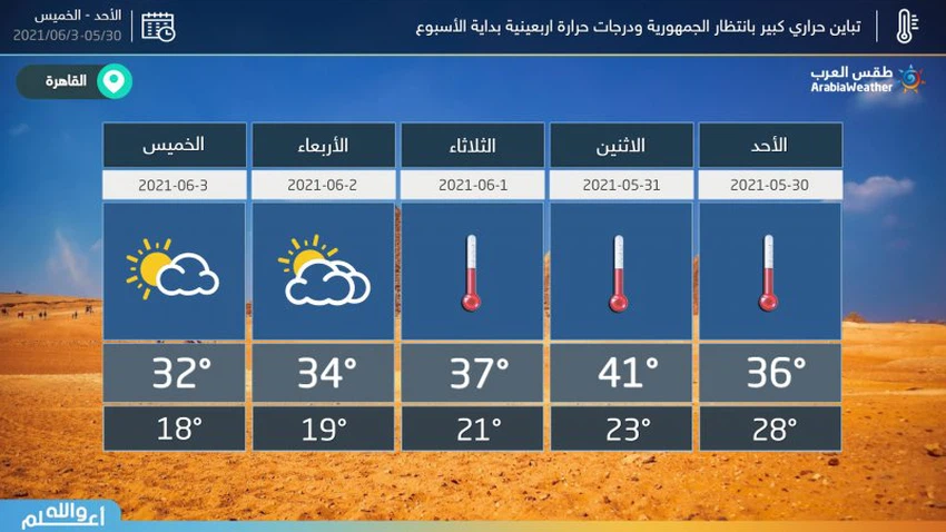 ويبتعد المنخفض الجوي الخماسيني باتجاه بلاد الشام وتتجه درجات الحرارة إلى الانخفاض يوم الثلاثاء، لكن تبقى الأجواء الحارّة هي السائدة في مختلف المناطق، وتكوم الرياح شمالية معتدلة السرعة، تنشط احياناً وتكون مثيرة للغبار في المناطق الجنوبية، وتظهر بعض السحب على ارتفاعات متوسطة وعالية، بحيث تتهيأ الفرصة لسقوط زخات متفرقة من الأمطار في مناطق عشوائية ومتفرقة من مصر.