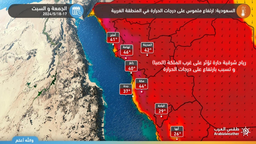 طقس العرب - سنان خلف - نبه كادر التنبؤات الجوية في طقس العرب من حدوث ارتفاع كبير على درجات الحرارة في مكة المكرمة والمشاعر المقدسة خلال الأيام القادمة، وذلك كنتيجة لهبوب رياح شرقية جافة وحارة للغاية، بحيث تسود أجواء حارة ومرهقة بشكل عام.
