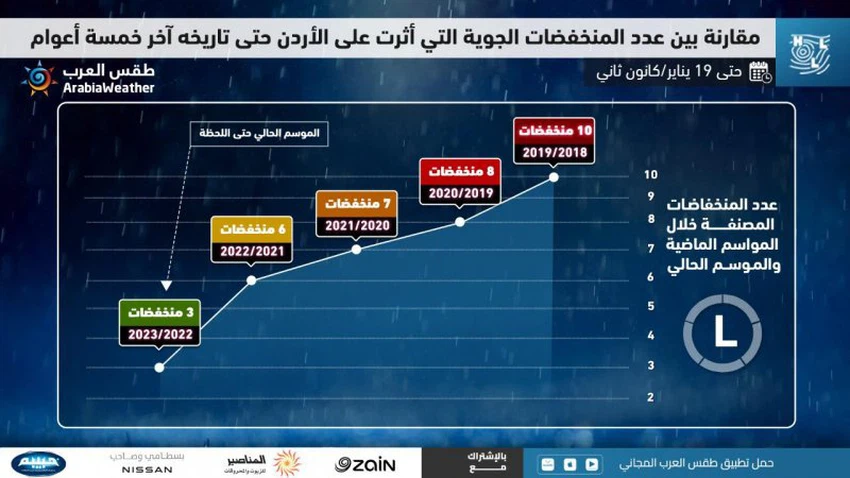 علاوةً على مُعدلات الأمطار الضعيف و الذي يُمكن وصفه بالمُقلق في بعض مناطق المملكة فيما لو قارناه بالمُعدل المُفترض أن يهطل حتى هذا الوقت من العام. تُظهر ذات البيانات الأرشيفية في مركز طقس العرب انخفاض عدد المُنخفضات الجوية (المُصنفة) و التي أثرت على الأردن في الموسم المطري الحالي 2022/2023 بشكل ملحوظ و كبير بالمقارنة عما كان عليه الحال لمثل هذا الوقت من في المواسم المطرية الماضية، كما هو موضّح أدناه: