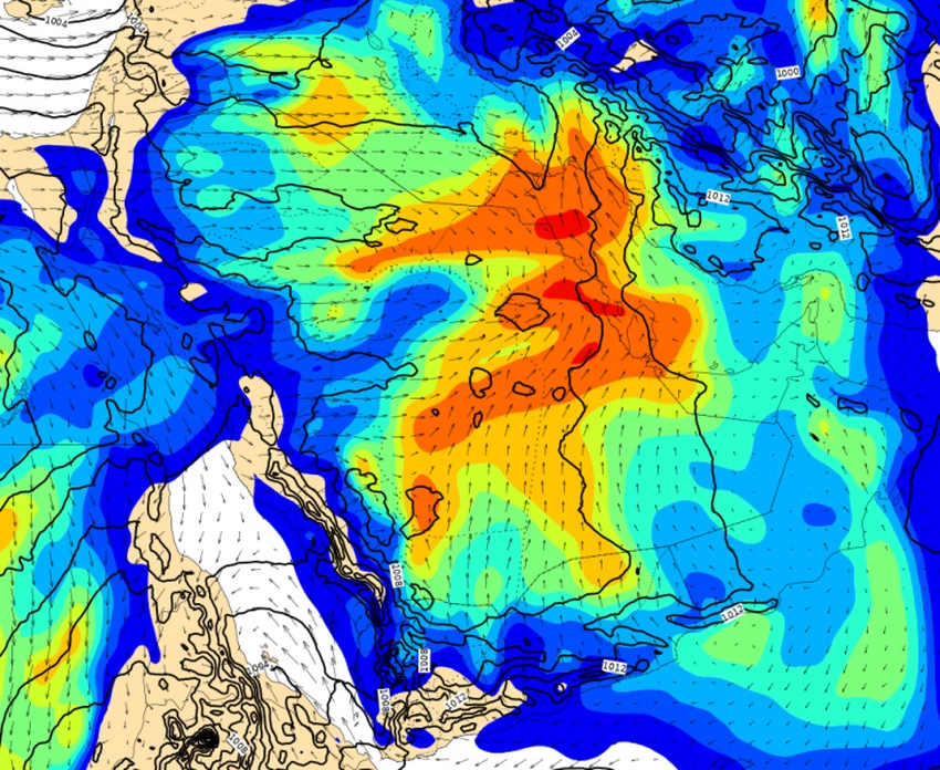 وتميل الخريطة المرفقة كثافة الغبار المتوقعة بحسب المركز الاوروبي، حيث يشير اللون الازرق والاصفر الى غبار خفيف وعالق، وصولا الى اللونين الاحمر والبني الى غبار متوسطة الى كثيفة.