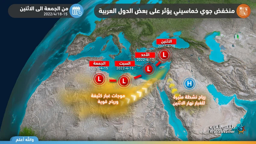 يتحرك المنخفض الجوي نحو تركيا، مما يعني انتقال الاحوال الجوية الخماسينية الى شمال غرب مصر وسيناء وبلاد الشام بما فيها الاردن، لذا يتوقع طقس العرب ان يتزايد نسب الغبار في الاجواء بالتزامن مع سيطرة الاجواء الحارة