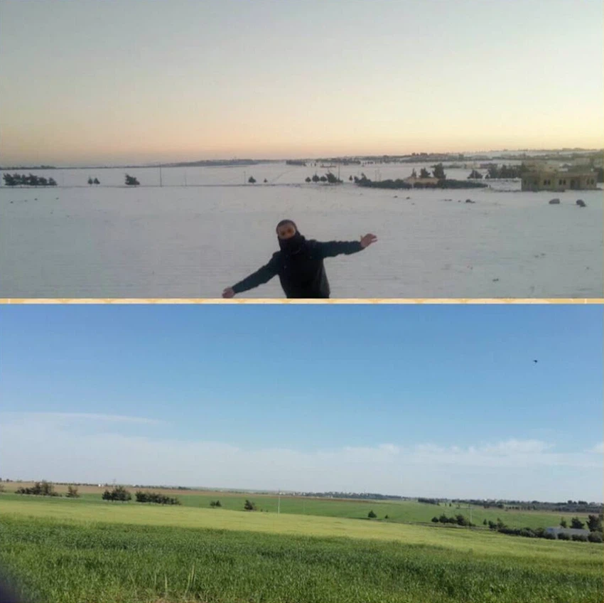 الصورة الأولى مُلتقطة بعد العاصفة الثلجية التي ضربت المملكة خلال شهر ديسمبر 2013، في حين أن الصورة الثانية مُلتقطة بعد أكثر من 4 أشهر في ذورة فصل الربيع في المنطقة، حيثُ استبدل منظر الثلوج بمشاهد لحقول القمح الخضراء المُمتدة على مدّ البصر.