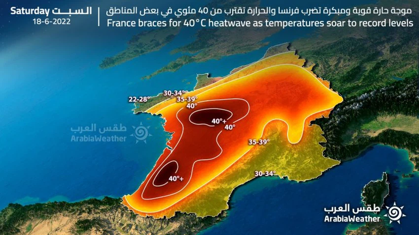 مُخرجات النمذجة الحاسوبية في مركز طقس العرب تُشير إلى توقعات بإمتداد الكتلة الحارة إلى غرب أوروبا، لتؤثر بشكلٍ مُباشر على فرنسا يوم الجمعة ويتعمق تأثيرها يوم السبت لترتفع على إثرها درجات الحرارة لأكثر من مُعدلاتها الإعتيادية بحوالي 10-15 درجة مئوية، بحيث تقترب من حاجز 40 درجة مئوية في بعض المناطق، وسط طقس حار ومرهق وجاف.