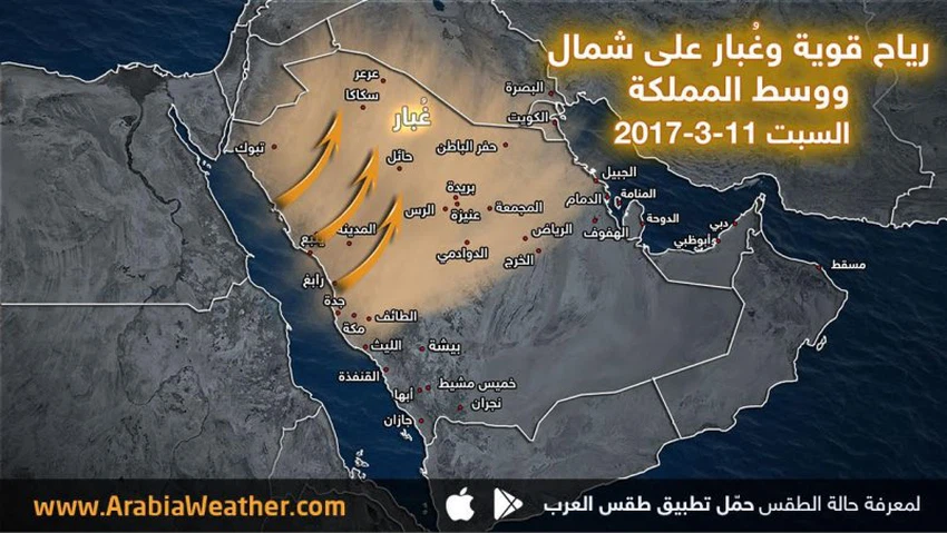 نهار السبت بمشيئة الله يزداد تعمق الكتلة الهوائية الباردة في أجواء المنطقة وهو ما سيدفع برياح غربية إلى جنوبية غربية قوية السرعة مثيرة للاتربة والغبار، تُصحب بتدني كبير في مدى الرؤية الأفقية قد يصل في بعض المناطق إلى ما دون الـ 500 متر.
