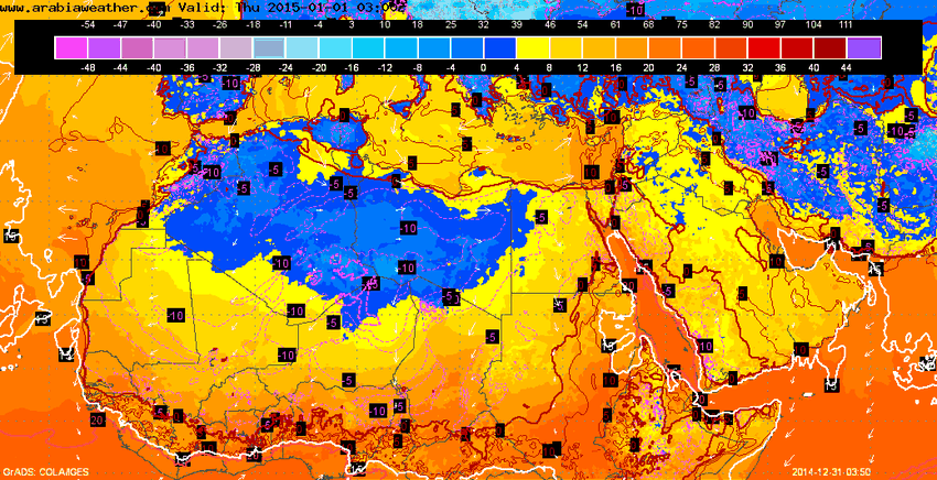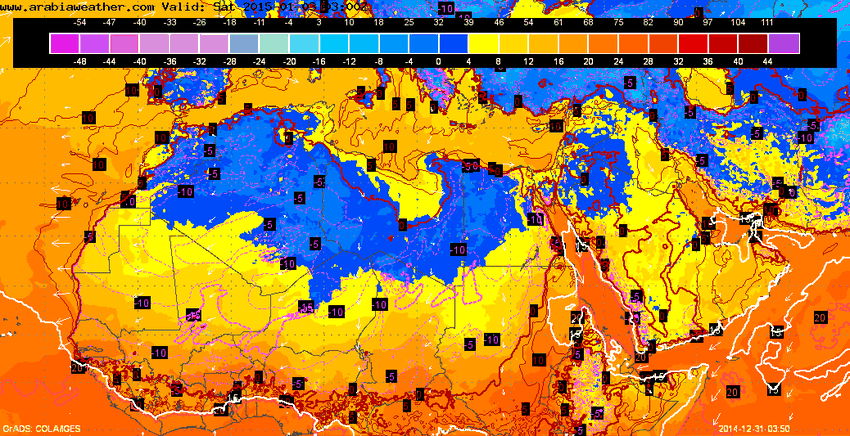وستكون، بمشيئة الله، ذروة اتساع الأجواء الباردة ليلاً مع ليلة الجُمعة/ السبت، حيثُ ستنخفض درجات الحرارة ليلاً حول الصفر المئوي في أجزاء واسعة من الوطن العربي، ليشمل ذلك المناطق الجبلية والصحراوية من المغرب وصولاً إلى الجزائر وتونس وليبيا ومصر، إضافة إلى بلاد الشام والعراق وشمال السعودية.