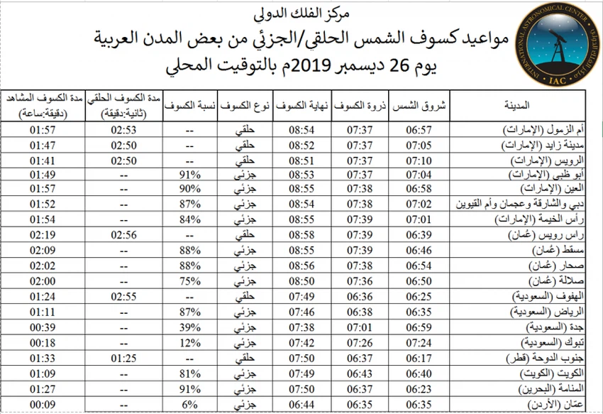 مواعيد الكسوف في بعض المدن العربية بالتوقيت المحلي