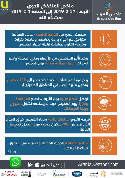 وبشكل تفصيلي نورد لكم مُلخص المنخفض الجوي إعتباراً من يوم الأربعاء الموافق 27 شباط حتى يوم الجمعة كما هو مُوضح في الصورة التالية :