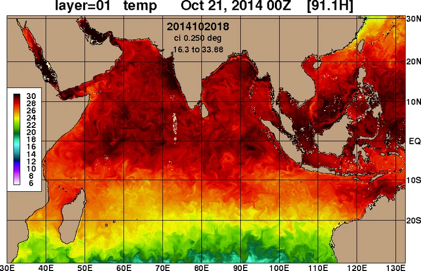 خارطة توضح حالة درجات حرارة سطح المياه شمال المحيط الهندي
