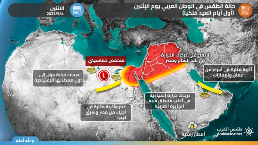 ويتمركز المُنخفض الجوي الخماسيني شرقاً يوم الأربعاء 4-5-2022 ليتمركز فوق الأراضي العراقية، وتتحول الرياح لتُصبح غربية رطبة على بلاد الشام وشمالية مصر، تنخفض بذلك درجات الحرارة في عموم مناطق بلاد الشام ومصر بإذن الله، وفي ذات الوقت ترتفع درجات الحرارة في أجزاء واسعة من شرق ووسط وشمال شرق السعودية والعراق والكويت، وتنشط الرياح وتُثير الأتربة والغبار في أجزاء من شمال ووسط وشمال غرب السعودية خاصةً نواحي تبوك.