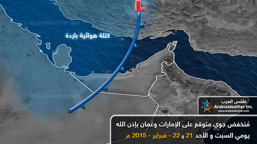 أما يوم السبت، فيطرأ انخفاض كبير على درجات الحرارة ويتغيّر اتجاه الرياح بعد الظُهر والمساء ليُصبح شمالياً غربياً بسبب اقتراب جبهة هوائية باردة يبدأ تأثيرها على الدولة مع ساعات عصر ومساء السبت، حيثُ تتكاثر السُحُب تدريجياً وتتهيأ الفرصة لهُطول زخات من الأمطار، قد تكون غزيرة في بعض المناطق ومترافقة مع حدوث الرعد وربما تساقُط للبرد، كما يستمر البحر مُضطرباً بشكل عام.