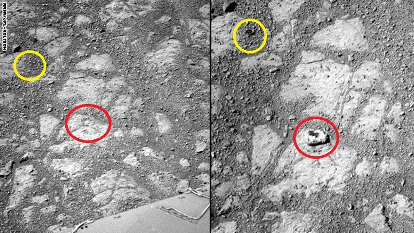 وكالة الفضاء الامريكية ناسا قامت ببث صورتين مختلفتين التقطتا من نفس الموقع بفارق زمني قدر بـ 12 يوماً تظهر من خلالها الصخرة بالدائرة الحمراء، الا انه واثناء نظرنا في الصورة المرفقة لفت انتباهنا وجود جسم آخر اشرنا اليه من خلال الدائرة الصفراء، ويبقى العلم حائراً امام العديد من الظواهر الغريبة في العالم المحيط.