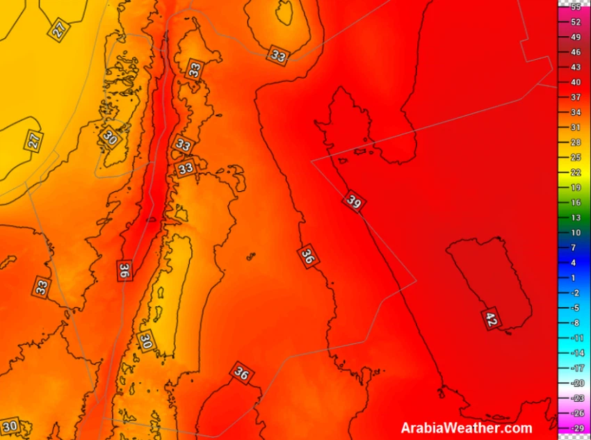 * خريطة لدرجات الحرارة العظمى المتوقعة نهاية الأسبوع،