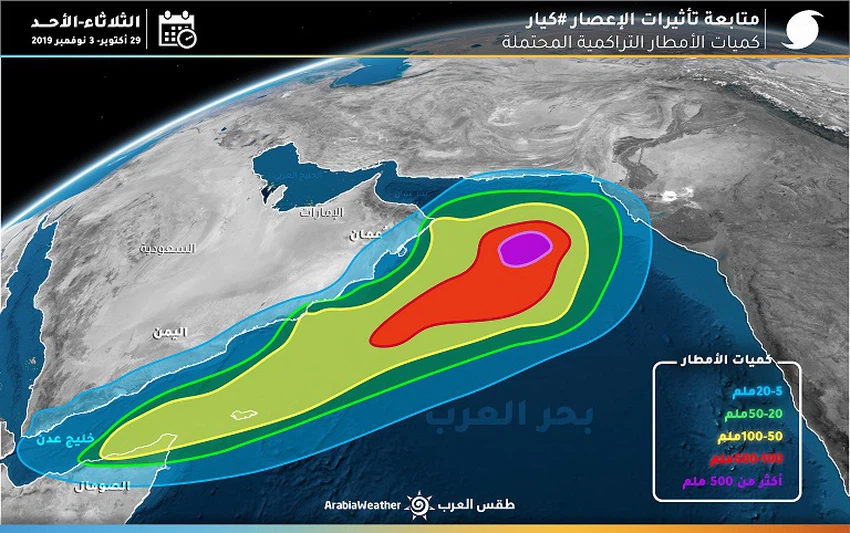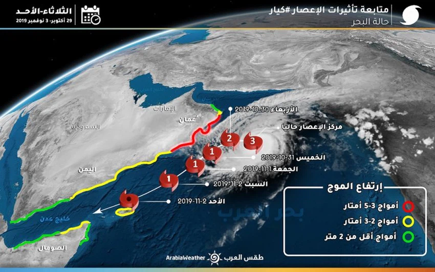 طقس العرب: قُطر عين اعصار كيار في بحر العرب تتجاوز الـ 60 كم