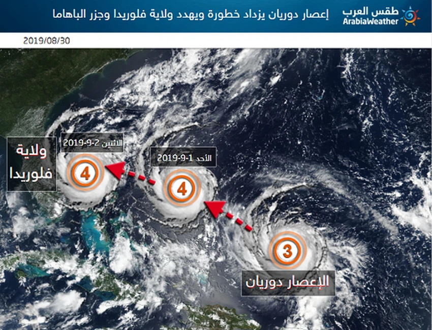 ومن المُتوقع أن يتطور الإعصار دوريان إلى اعصار مُدمر من الدرجة الرابعة، على أن يضرب كل من الباهاما وولاية فلوريدا الأمريكية يوم الاثنين الموافق لـ 2 سبتمبر 2019.