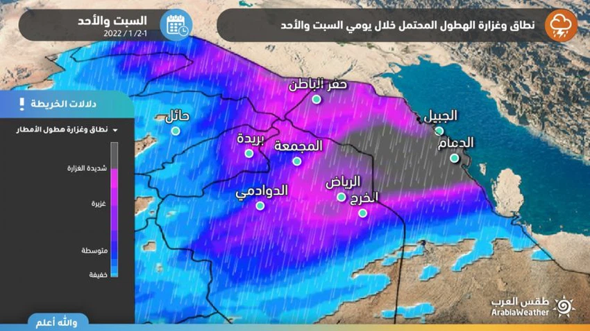 وفي التفاصيل فيُتوقع بمشيئة الله مع ساعات مساء يوم السبت وليلة السبت/الأحد، أن تبدأ جبهة هوائية باردة ذات فعالية عالية بعبور أجواء المنطقة الشرقية والوسطى من المملكة، ما سيعمل على حدوث اشتداد كبير في الحالة الماطرة، وتشكل سحب رعدية عالية القوة، تترافق بعد مشيئة الله بالأمطار ذات الغزارة العالية والتي يُعتقد أنها ستكون الكثر شدة وشمولية منذ سنوات، ولا يُستبعد أن تترافق بزخات من البرد المتراكم.