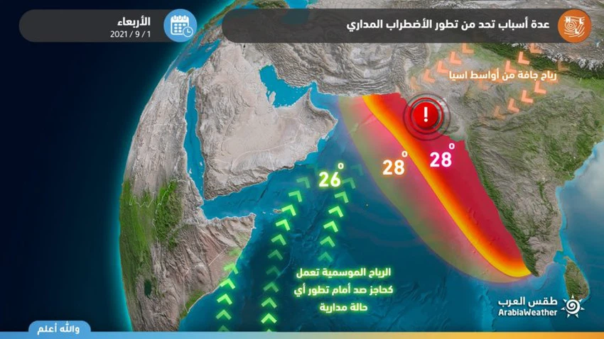 وحول احتمالية تطور الإضطراب المداري إلى عاصفة مدارية أو اعصار فقد أكد فريق التنبؤآت في مركز طقس العرب الإقليمي أن الإضطراب المداري الحالي المتمركز إلى الشرق من بحر العرب سيخوض حرباً مع العديد من العوامل القاتلة التي تحُد من طاقته وتعمل على تلاشيه قبل اقترابه من السواحل الجنوبية لشبه الجزيرة العربية.
